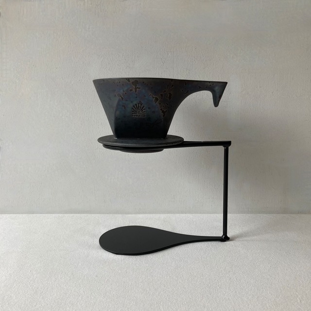 鹿児島で作られているワンキルンの器は、 主に型を使って製作することで形はきれいに整えられ、 鉱物や灰などを釉薬に混ぜることで、一点ごとに異なる表情が現れます。 写真では少し分かりにくいかもしれませんが、 落ち着いた黒の中に玉虫色が散りばめられたとても美しいシリーズです。 油跡や水跡が付くこともありますが、 使い込むほどにしっとりとした独特の深い黒に変わっていく 経年変化も楽しむことができます。 ONE KILN のコーヒードリッパーとRoam松田創意さんが作られたスタンドを合わせたコーヒードリッパーセットです。 オブジェのようなかっこいい佇まいです。 珈琲を淹れる時間を楽しみながらインテリアとしてもお楽しみ頂けます。 【dripper】 size : 約 Φ120 x d 170 × h 85 mm(若干の個体差があります。) 素材 : 磁器 【stand】 size : 約 Φ90 x d 170 × h 140 mm 素材 : 鉄 (溶接箇所は多少凸凹しているいます。また初めから表面にかなり目立つ擦れ傷のある品となります。予めご了承ください。) ※ 当店ではセットの販売となり単体の販売はしておりません。ご了承下さい。 ※ 1点1点表情が異なります。 お届けさせていただくものは、写真とは全く同じではありません。 予めご了承ください。 ※ 作られた時期によって、若干の厚みや、釉薬のかかり方、色などが変化します。 お買い足しの際は、上記のような多少の違いがあることをご理解の上、ご検討ください。 ※ 火山灰を使った独自の釉薬を使用してます。 使い始めは、釉薬に含まれる鉄分が表面に残っていることもあります。 成分検査済みで、人体に影響はありませんが、よく洗ってからお使い下さい。 直火不可 / 食洗機可 電子レンジ・オーブンをご使用の際は、 急激な温度変化をさせないよう注意してご使用ください。 例 ) 温まった状態で水につける。 冷蔵庫から出して、すぐにレンジにかける等。