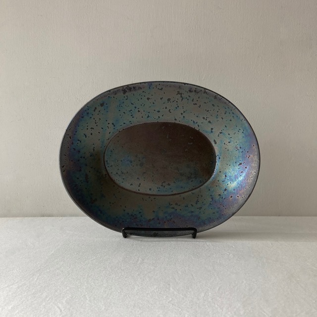鹿児島で作られているワンキルンの器は、 主に型を使って製作することで形はきれいに整えられ、 鉱物や灰などを釉薬に混ぜることで、一点ごとに異なる表情が現れます。 写真では少し分かりにくいかもしれませんが、 落ち着いた黒の中に玉虫色が散りばめられたとても美しいシリーズです。 油跡や水跡が付くこともありますが、 使い込むほどにしっとりとした独特の深い黒に変わっていく 経年変化も楽しむことができます。 少し深みのあるオーバル型のボウルです。 カレーやパスタなどをたっぷりと盛ることもできるし、 メインディッシュ、サラダ、副菜を一緒に盛り合わせるワンプレートにも使えるので、 幅広くお使いいただけます。 size : 約 w260 xd200 xh40 mm(若干の個体差があります。) 素材 : 磁器 ※ 1点1点表情が異なります。 お届けさせていただくものは、写真とは全く同じではありません。 予めご了承ください。 ※ 作られた時期によって、若干の厚みや、釉薬のかかり方、色などが変化します。 お買い足しの際は、上記のような多少の違いがあることをご理解の上、ご検討ください。 ※ 火山灰を使った独自の釉薬を使用してます。 使い始めは、釉薬に含まれる鉄分が表面に残っていることもあります。 成分検査済みで、人体に影響はありませんが、よく洗ってからお使い下さい。 直火不可 / 食洗機可 電子レンジ・オーブンをご使用の際は、 急激な温度変化をさせないよう注意してご使用ください。 例 ) 温まった状態で水につける。 冷蔵庫から出して、すぐにレンジにかける等。