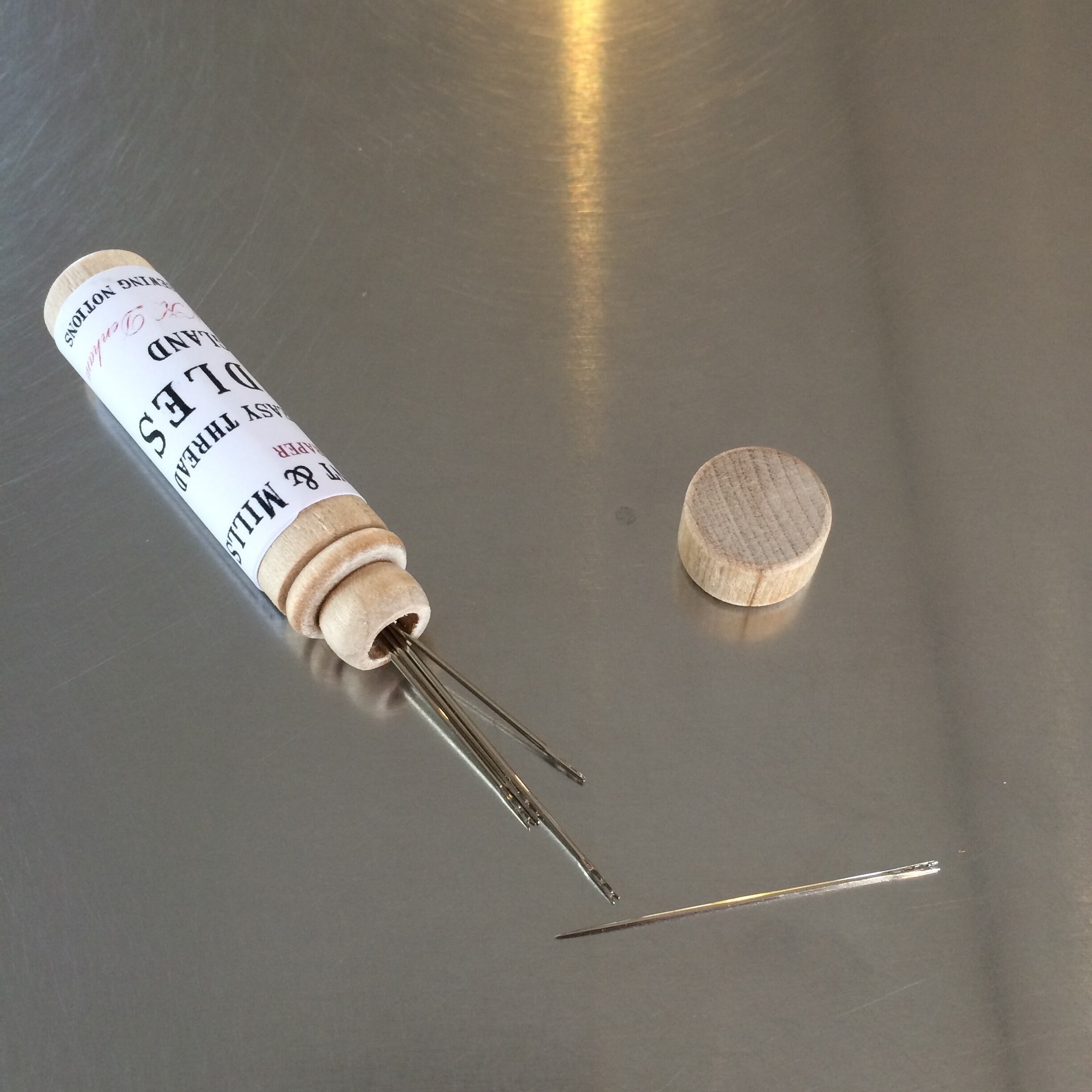 いろいろなサイズの糸通し不要の縫い針が、小さな木筒に12本入り。