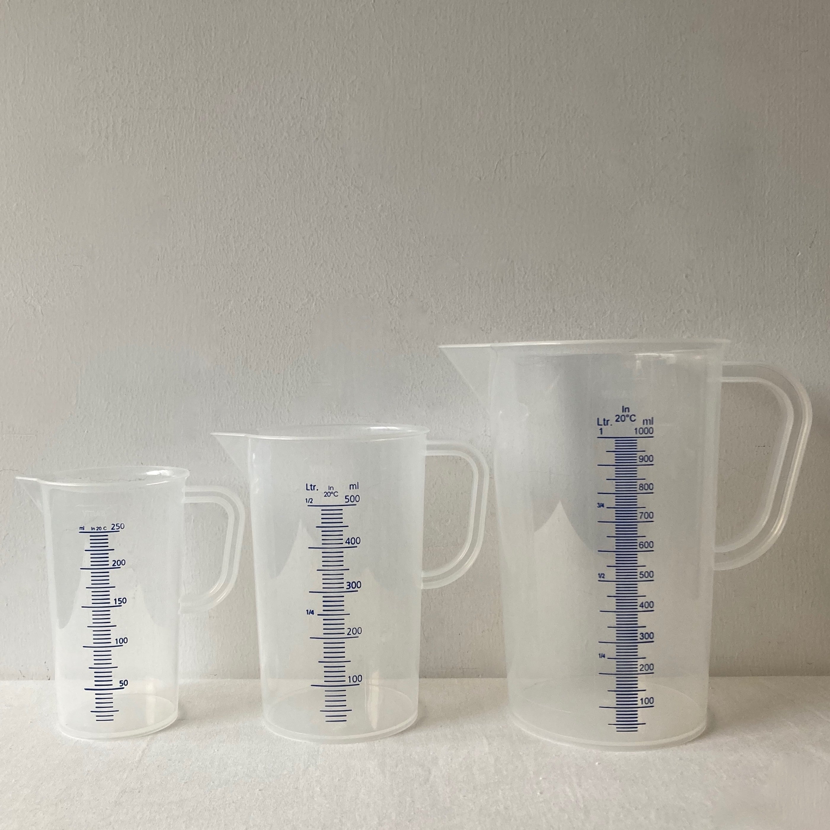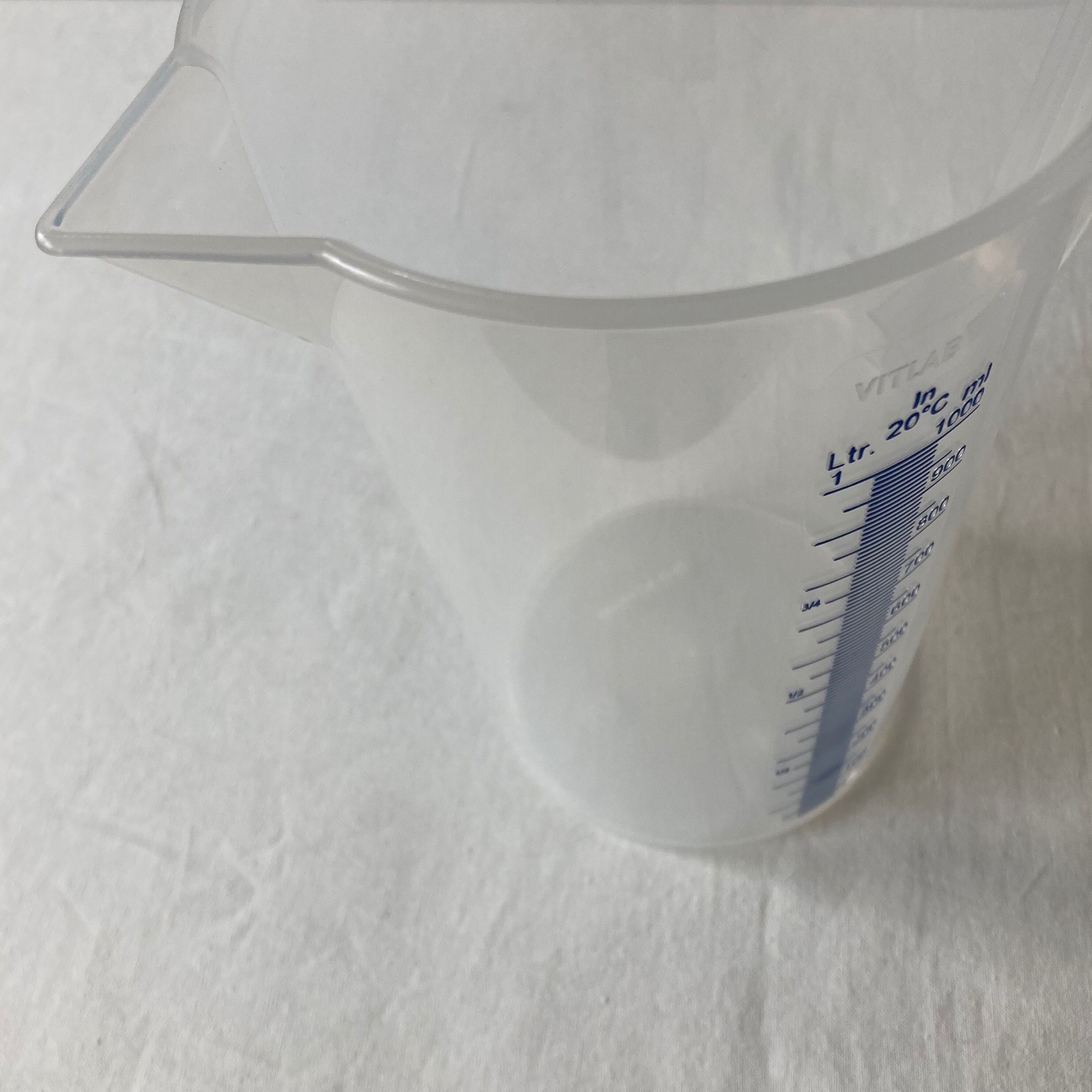 目盛りは10ml刻み、数字は100ml毎に記されています。