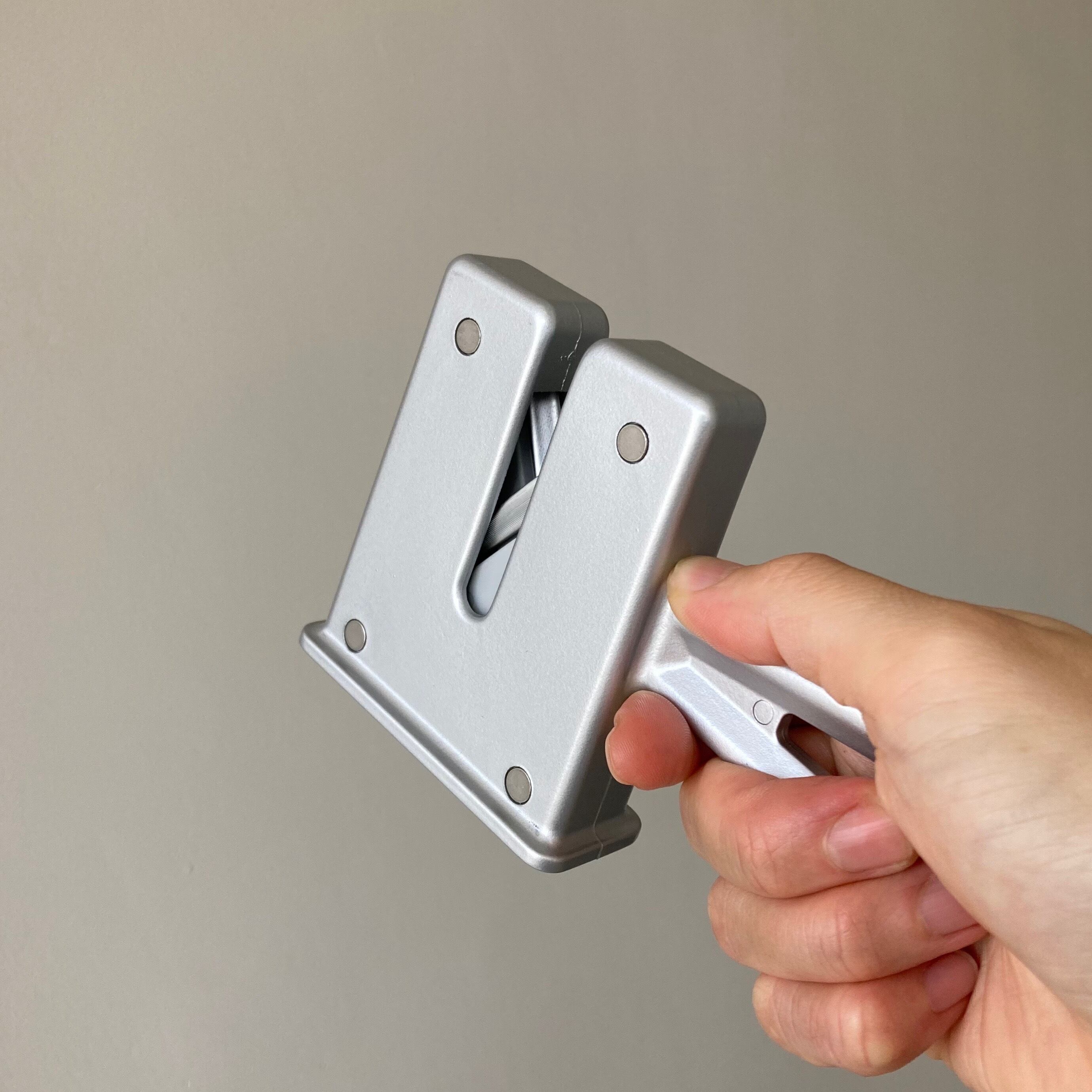 取手を握り、V字になった2本のスチールの上に刃を乗せ、