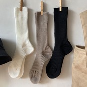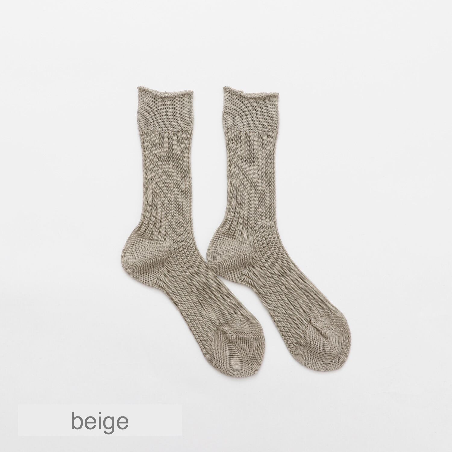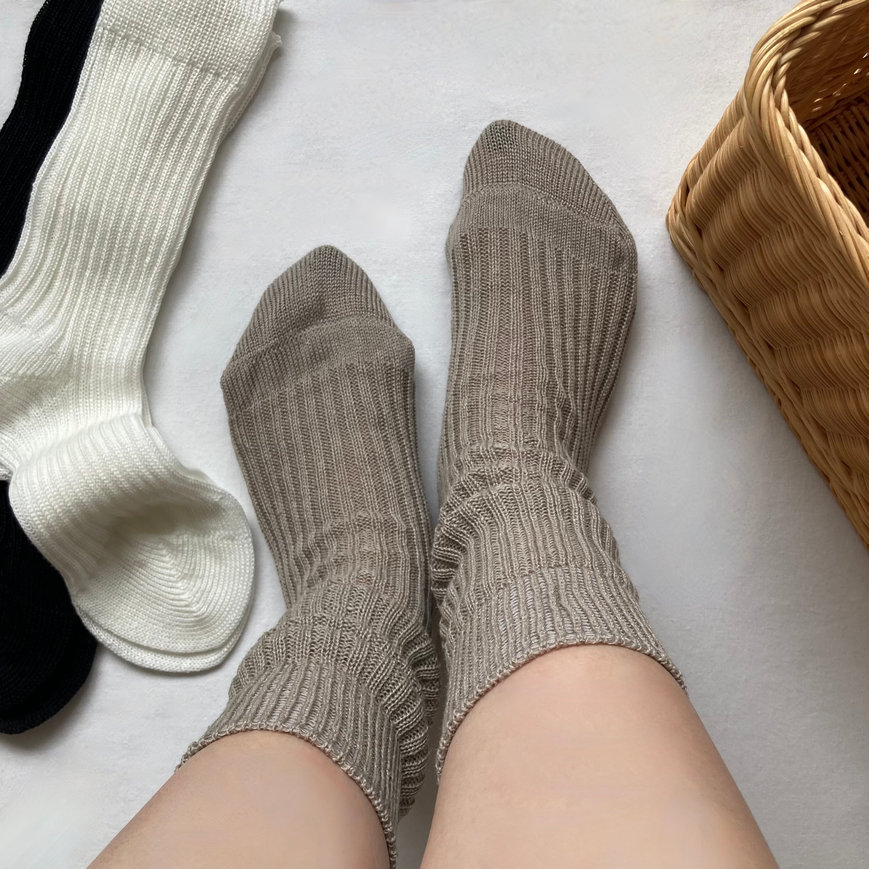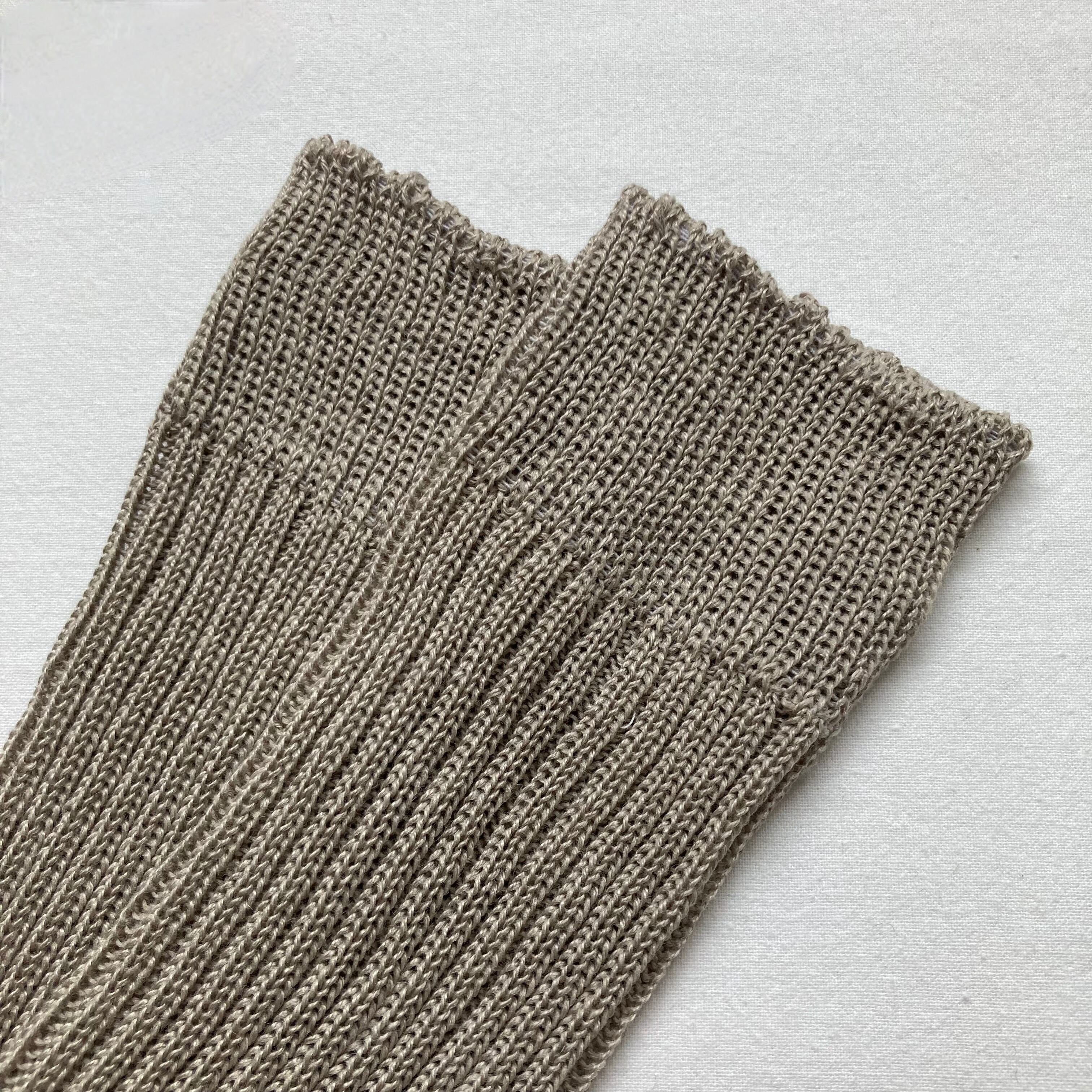 リネン糸でざっくりと編み立てた少し透け感のあるソックスです。